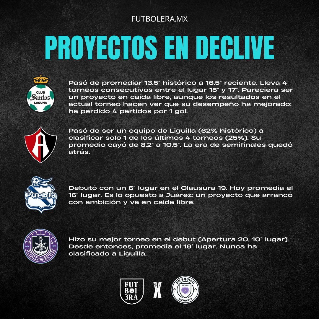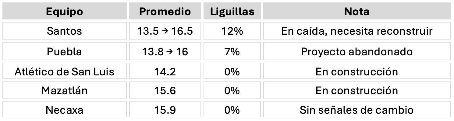 Santos es el caso más grave. Pasó de promediar 13.5° histórico a 16.5° reciente. Lleva 4 torneos consecutivos entre el lugar 15° y 17°. Pareciera ser un proyecto en caída libre, aunque los resultados en el actual torneo hacen ver que su desempeño ha mejorado: ha perdido 4 partidos por 1 gol.