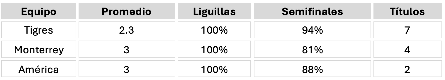 Élite: Tigres (2.2°), Monterrey (3°) y América (3°) han clasificado a Liguilla en el 100% de los torneos. Entre los tres acumulan 13 de los 16 campeonatos. Su desviación estándar es bajísima: siempre están arriba.