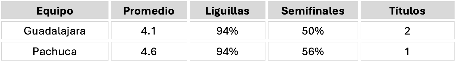 Aspirantes: Guadalajara (4.1) y Pachuca (4.6) clasifican a Liguilla en el 94% de los torneos. Tienen 3 títulos combinados. Están un escalón abajo de la élite, pero claramente separados del resto.