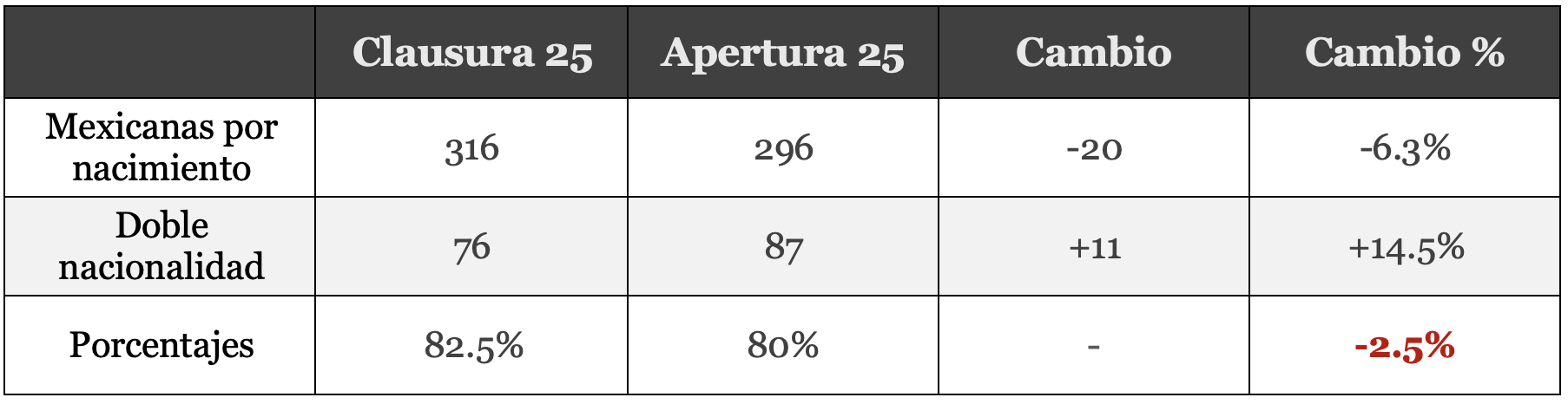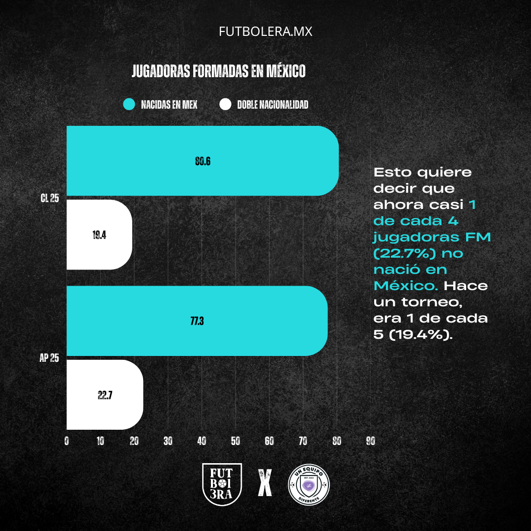 Un semestre después, en el Apertura 25, las jugadoras FM con doble nacionalidad crecieron de 76 a 87 (+11), el mayor incremento de esta categoría. A nivel porcentual, esa distribución cambió a 77.3% mexicanas y 22.7% doble nacionalidad.
