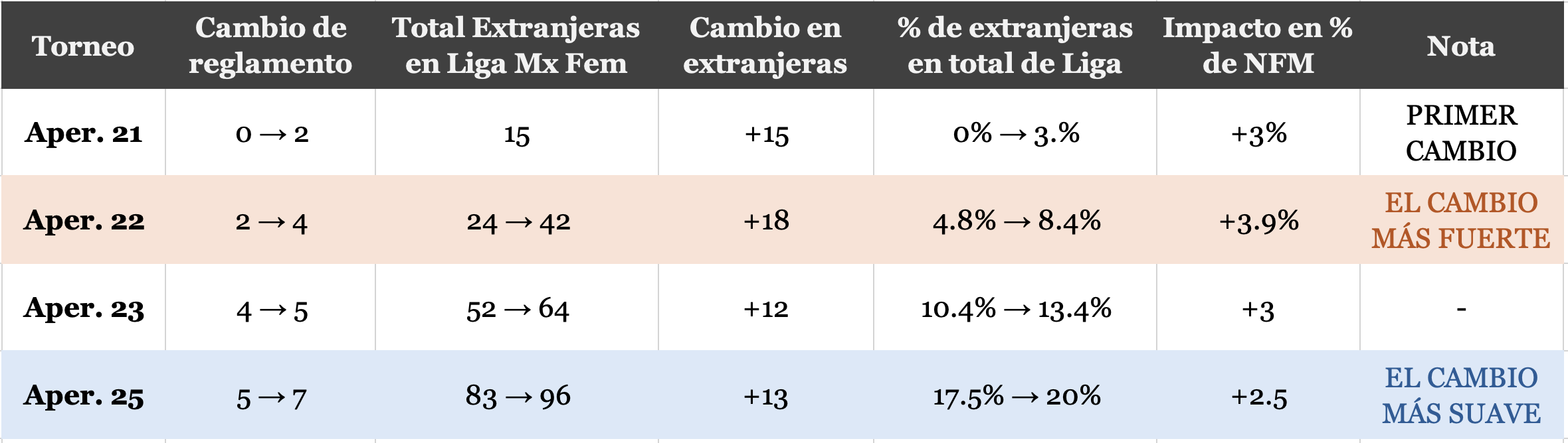 Cada vez que la Liga ha modificado el reglamento, el crecimiento porcentual de extranjeras ha sido de 3%, 3.9%, o 3%. Esta vez fue 2.5%. Por primera vez, el cambio fue ligeramente menor que todos los anteriores.